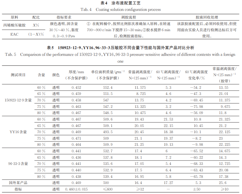 在涂布聚氨酯薄膜 Defense 1195 前,将原料丙烯酸压敏胶(YY16、150923⁃12⁃9、96⁃33⁃3)、EAC按照表4中的比例在物料桶中混合,然后将混合后的物料按照表4中规定的时间在高速分散机SWFS⁃7. 5中搅拌,制成可用于涂布的胶液。胶液在颜色透明,固含量值达到30 %~40 %,黏度值达到0. 3~0. 9 Pa·s时方可用于涂布。涂布后经多级鼓风干燥→复合→分切收卷后进行测试。