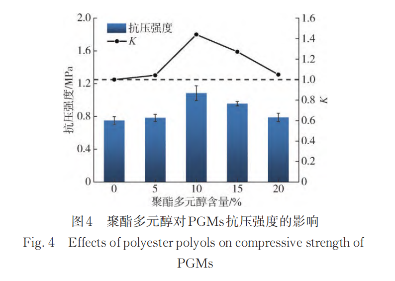 (1)当聚酯多元醇的掺量为10 %时,PGMs的抗压强度可达 1. 09 MPa;当掺量超过 10 %时,聚酯多元醇的苯环会限制分子链的运动,对 PGMs 抗压强度的提升产生负面影响,但此掺量下混合多元醇体系的抗压强度仍比纯聚醚多元醇体系要高;