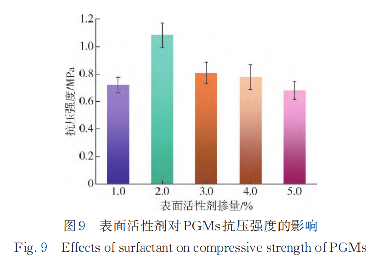 如图 9 所示,随着表面活性剂掺量的增加,PGMs的抗压强度先增大后降低。当表面活性剂掺量为2 %时,PGMs抗压强度达到最大,为1. 119 MPa。此时,表面活性剂降低体系的表面张力,抑制了小气泡的合并,使泡孔结构处于相对理想的状态,对 PGMs 的抗压强度起到积极作用。当表面活性剂掺量为 3 %时,虽然PGMs的泡孔结构相对完好,但其抗压强度出现下降。这可能是因为表面活性剂掺量过大,其塑化效果增强,导致材料抵抗外力作用减弱[35]。
