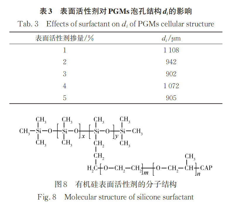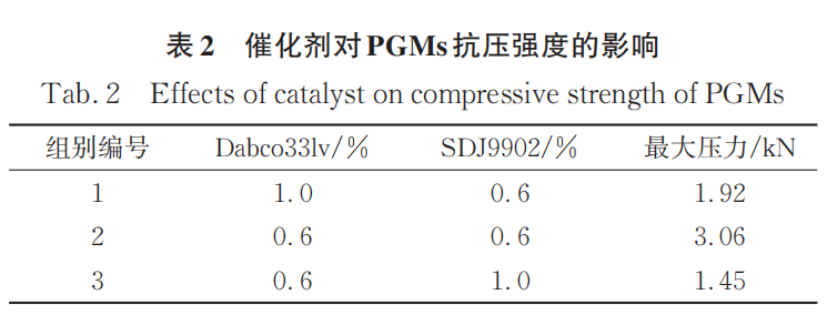 (2)当表面活性剂含量为 2 %时,PGMs 的泡孔结构形状趋于规则,di较小,其抗压强度达到最大值;催化剂与交联剂 TEOA,通过影响 PGMs 化学反应平衡方式影响PGMs的抗压强度;