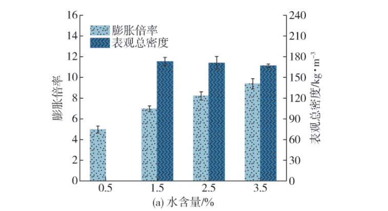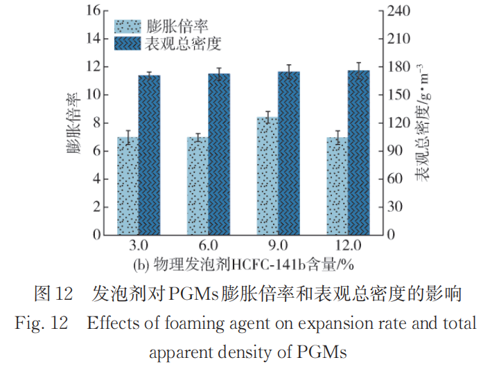 图12为发泡剂对PGMs表观总密度和膨胀倍率的影响。随着含水量的增加,PGMs 的表观总密度略微
