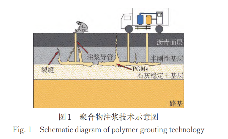 PGMs 属于聚氨酯硬质泡沫,因其优异的抗压强度、高膨胀倍率和耐化学性能等被广泛应用于基础工程[1‐2]。随着道路服役时间的延长,公路的半刚性基层受到温度、湿度变化的影响,在交通荷载的反复作用下容易产生反射裂缝[3‐4]。反射裂缝会造成集料松散、路面脱空等诸多问题,严重影响路基强度和路面使用寿命[5]。图 1 为 PGMs 修补道路反射裂缝的示意图,PGMs 以液体的形式被注入到道路基层内部,经反应膨胀后生成一定强度的固体,填充裂缝。PGMs 需要承受来自外部的压力,因此对 PGMs 抗压强度的研究具有重要意义[6‐7]。