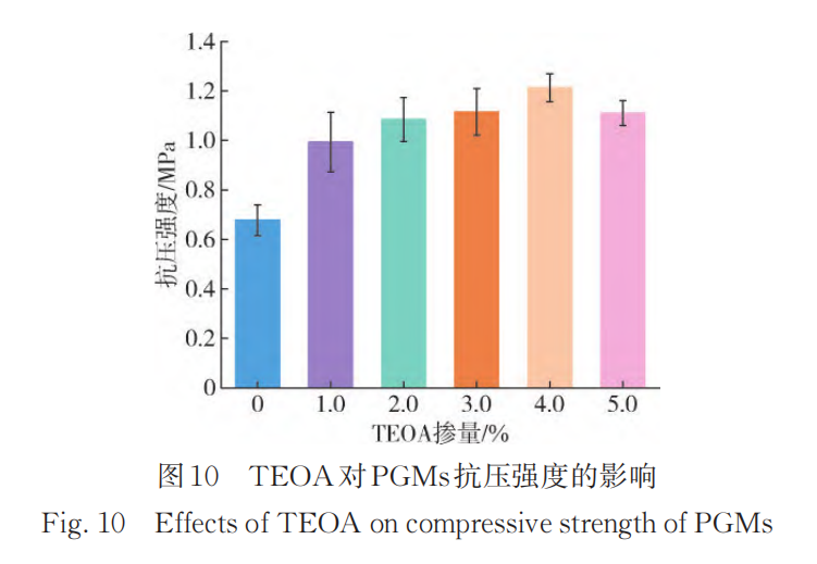 起到积极作用。但是当 TEOA 超过 4 %时,PGMs 的抗压强度降至 1. 11 MPa。此时的叔胺结构对发泡反应催化作用增强,使气体在体系固化前溢出,破坏了材料的泡孔结构[36]。此外,TEOA 对 PGMs 的微相分离