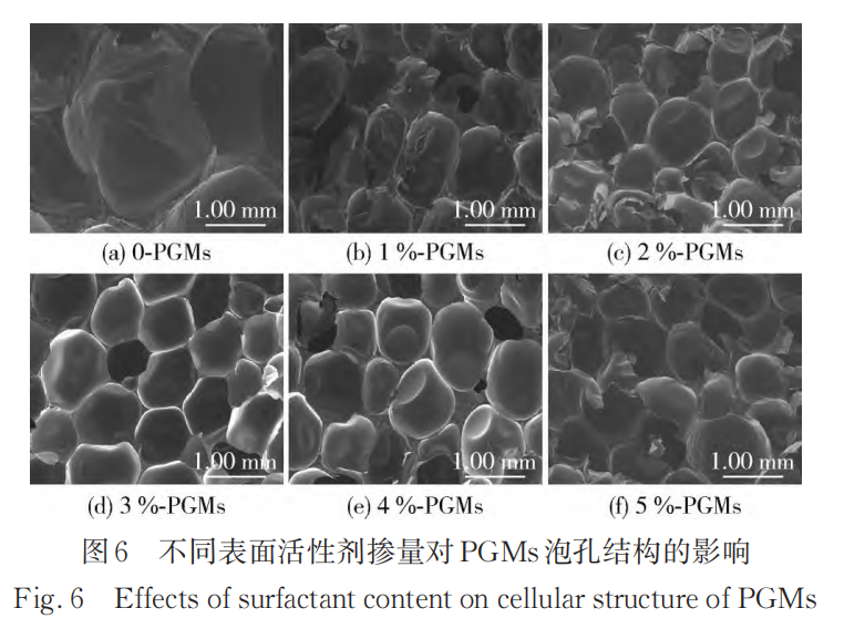 为探究表面活性剂对 PGMs 抗压强度的影响,将表面活性剂掺量设为 0、1. 0 %、2. 0 %、3. 0 %、4. 0 %和 5. 0 % 6 组,固定聚醚与聚酯多元醇的比例为 9/1,其他助剂含量与表 1 相同。图 6 为不同表面活性剂掺