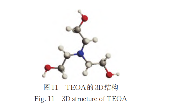 设聚醚与聚酯多元醇的比例为9/1,其他助剂含量与表 1相同。交联剂 TEOA对 PGMs抗压强度的影响如图 10所示,可见 TEOA对 PGMs的抗压强度的影响很显著,PGMs 的抗压强度随着 TEOA 掺量的增加先增大后减小。TEOA含量达到4 %时,PGMs的抗压强度达到最大,为 1. 21 MPa。TEOA 的 3D 结构如图 11所示,其含叔胺和多羟基的分子结构能提高发泡的反应速率,并且与—CNO 反应形成氨基甲酸酯,形成三维网络结构,提高聚氨酯分子链间的相互作用力[20]。掺量从零增加到 4 %的范围内,TEOA 化学交联作用明显,并为反应提供了碱性环境,对PGMs的抗压强度