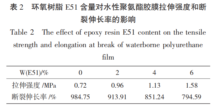 (3)随着环氧树脂 E51 含量的增加,胶膜的拉伸强度会增大,断裂伸长率降低,耐水性能提高