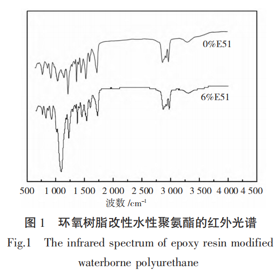 (1)通过红外光谱进一步分析研究可知,环氧树脂 E51 可被成功地直接引入到聚氨酯分子链中。本试验成功制备了环氧树脂改性水性聚氨酯乳液。