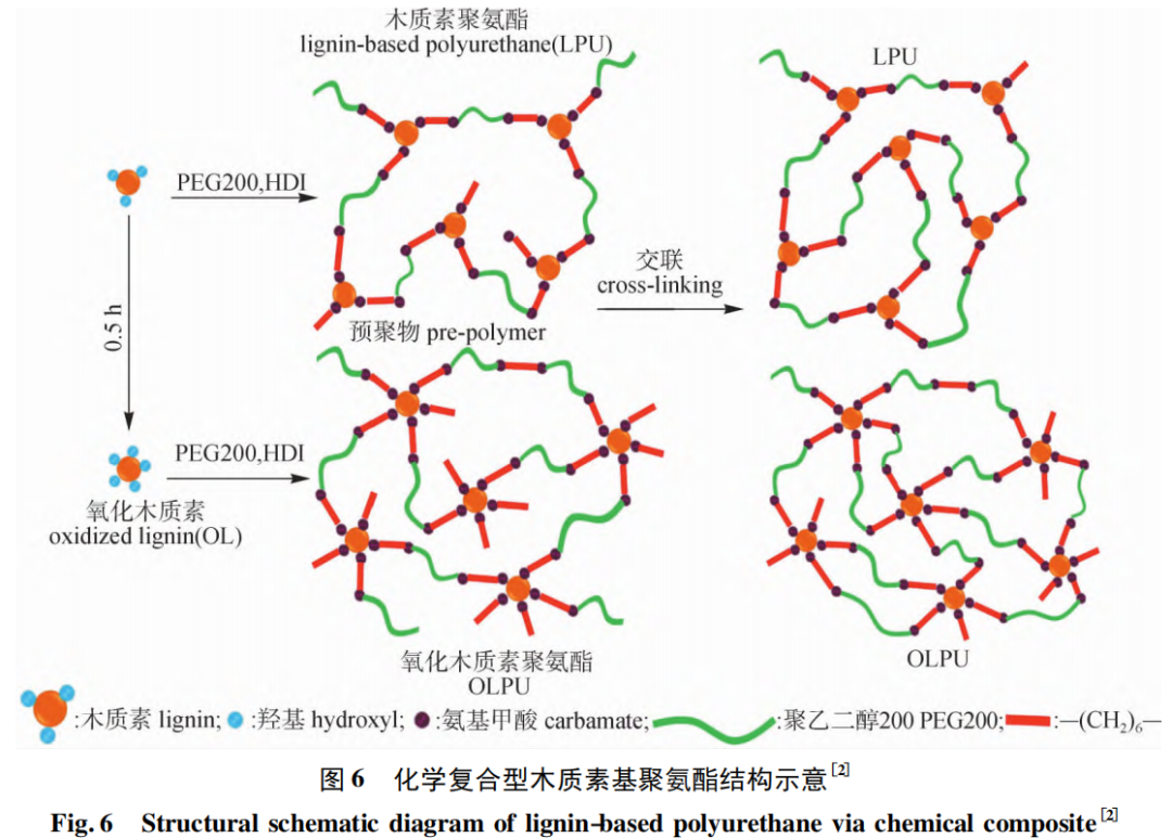 木质素表面含有一定量的羟基结构,通常对极性的异氰酸酯聚合物基质表现出一定的亲和力,当木质素作为增强填料与 PU 胶黏剂混合时,不仅可以增加 PU 胶黏剂的黏度,避免胶黏剂黏度过低导致透胶现象,同时在一定的条件下还可以增强胶黏剂的力学性能。但由于木质素与木质素之间的差异较大且本身结构复杂,在实际的混合操作中很难实现其与 PU 或异氰酸酯的有效共混,单靠物理混合的方式,很难实现木质素基聚氨酯胶黏剂的广泛应用。