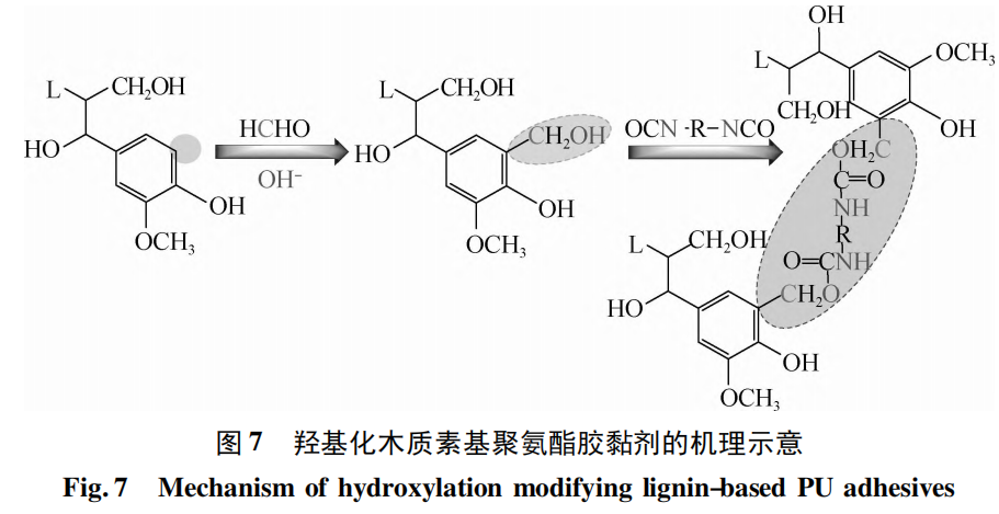 Chen 等[50 - 51]将乙酸木质素在碱性甲醛溶液中进行加热处理,所制备出的木质素的羟甲基比未改性前增加了 189. 11% ,达到 2. 92 mmol /g,将其与甲苯 2,4-二异氰酸酯( TDI) 反应制备 PU 胶黏剂,其胶接金属片时的拉伸强度可达到 32 ~ 74 MPa,并且在一定范围内随着改性木质素含量的增加,胶黏剂的力学性能和耐热性能都有一定的提高。Mansouri 等[52]使用乙醛以两种不同的质量比将木质素磺酸钙羟烷基化,并将该两种改性木质素与酚醛树脂和 PMDI 进行复配制备人造板用胶黏剂,结果表明: 这类胶黏剂在刨花板中的内结合强度为 0. 39 ~ 0. 81 MPa,经过沸水处理后仍获得了较好的内结合强度,大部分在 0. 15 ~ 0. 21 MPa 之间。Lei 等[53]利用乙二醛羟乙基化改性木质素后与异氰酸酯( PMDI) 和酚醛树脂复合制备应用于刨花板生产的胶黏剂,同时以含羞草单宁提取物替代酚醛树脂作为参比,探讨了利用绿色生物质原料制备木材胶黏剂的可能性。结果表明: 利用木质素、单宁等生物质资源制备的生物质复合木材胶黏剂能够应用于黏接刨花板,在干燥的情况下,刨花板内结合强度在 0. 16 ~ 0. 53 MPa 之间,基本能够满足木材刨花板制造的相关国际标准的要求,且胶黏剂中的天然材料的占比可达到胶黏剂总质量的 80% 。王森[54 - 55]在碱催化条件下使用乙二醛对玉米秸秆木质素进行羟乙基化改性,当乙二醛的质量为木质素的三分之一时,总羟基含量相比未改性前翻了一番。之后将改性木质素、环氧氯丙烷以及 WPU 乳液三者共混,制备出湿胶合强度最高能达到 1. 17 MPa 的Ⅱ类胶合板用胶黏剂。尽管羟烷基化改性可以提高木质素中的醇羟基含量,降低木质素与异氰酸酯基反应的能量和位阻,但羟烷基化改性后木质素在 PU 胶黏剂中的用法可灵活设计,从而使得最终产品的胶接性能并不统一。