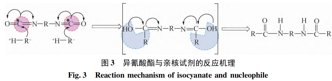 一般的 PU 体系,通过含活泼氢的化合物和含异氰酸酯基( —N==C==O) 的化合物进行加成反应后,逐步提高聚合物的 Mr 或使聚合物形成交联的三维网状分子结构。由于异氰酸酯基含有两个不饱和的化学键,同时基团中 C、N、O 因电子云密度分布不同,导致 O 原子带有极高的负电荷,可以吸引含活泼氢化合物电离出的 H + 形成羟基; C 原子的电负性则较小,易受带负电荷的基团进攻,最终经过化学键重排后形成氨基甲酸酯[17],其反应原理如图 3 所示。因此,理论上—NCO 可以与木质素中一切含有活泼氢的基团发生反应,如酚羟基、醇羟基和羧基等,已有大量的文献围绕木质素改性 PU 材料的应用研究进行了较系统的综述[18 - 20],比较集中的是制备薄膜材料[21 - 23]、泡沫材料[24 - 26]以及 PU 弹性体[27 - 29]等方面,而在胶黏剂[30 - 32]中的应用则并不太多。与木质素改性 PU 制备其他材料不同,胶黏剂要满足最基本的黏接性能要求,通过胶合强度的大小直接评判。另外,对被胶接材良好的润湿、合适的固化条件、较好的储存稳定性等也是实现木质素基 PU 良好黏接的必要条件。