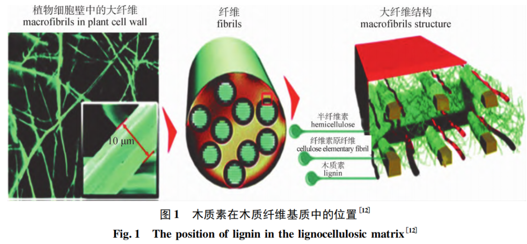 木质素本身是一种与工程塑料极为相似的,结构极复杂的、非结晶性的天然芳香高分子聚合物,它主要由 3 种基本结构单元组成,分别为紫丁香基( S) 苯丙烷、愈创木基( G) 苯丙烷和对羟基( H) 苯丙烷,3 种基本结构单元通过醚键( 如 β-O-4、4-O-5 和 α-O-4) 和 C—C( 如 β-5、β-1、5-5) 等约 20 种连接方式[10 - 11]连接成复杂的大分子,其在植物纤维中的位置如图 1[12]所示。天然木质素在水中以及大部分常见溶剂中的溶解性较差,只在某些特定溶剂中才能较好地溶解,比如含水的二氧杂环己烷溶液。而且在提取分离天然木质素时,由于自身的反应活性很强,木质素极易发生自聚合反应和氧化反应,因此很难从植物中获得 100% 的原始木质素。目前工业化利用的木质素主要来自于工业生产中的副产品,也称为工业木质素,且由于使用了不同的提取方式,因此得到的木质素结构、性能上存在巨大差别; 如碱木质素,其平均相对分子质量( Mr) 相对较高,在酸性条件下的溶解度很低,但能较好的溶解在 pH 值较高的溶液中; 而木质素磺酸盐可溶于水中,但不溶于大多数有机溶剂[13]。