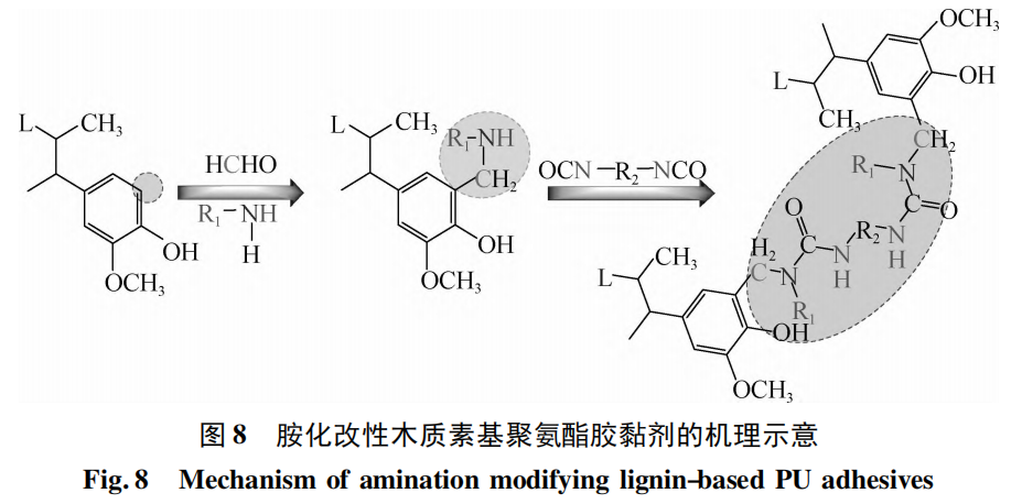 理论上,伯胺、仲胺都可以与木质素进行胺化反应,但由于仲胺经过胺化反应接入木质素后,会进一步变为三级胺( 叔胺) 并失去电离出活泼氢的能力,并不能提高木质素的反应活性,也不利于最终 PU 胶黏剂性能的改善,因此在选择木质素的胺化试剂时,应该以含有伯胺的化合物为主。另外,受到木质素改性方法的限制,木质素经过胺化改性后,所得的胺化木质素的产率和反应活性仍有限,导致 PU 胶黏剂性能的提升也有限,因此并未得到广泛的应用[59]。