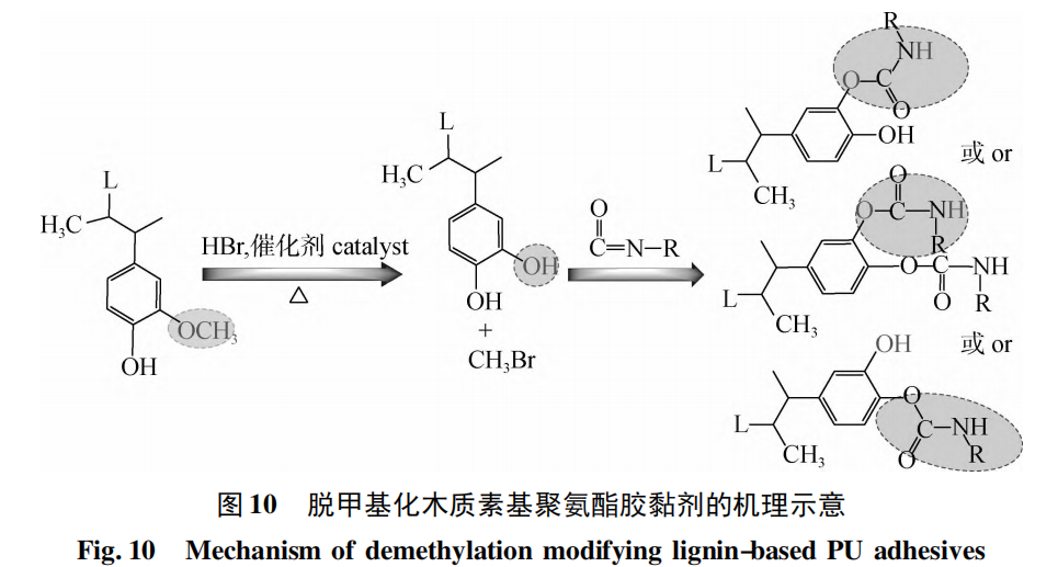 甲氧基是木质素最具特征的官能团,一般是连接在苯环上酚羟基的邻位,占据了木质素苯环结构中的活性位点( 酚羟基的邻、对位) 。脱甲基化改性则是将木质素苯环上的甲氧基,经过化学处理脱去亚甲基形成酚羟基的过程( 图 10) 。Chen 等[66]用乙酸处理甘蔗渣,从中提取出乙酸木质素,并采用 HBr催化木质素脱甲基,制备脱甲基化改性的多酚羟基木质素,并用改性的木质素部分代替多元醇,与 TDI聚合生成 PU 胶黏剂。研究表明: 经过脱甲基改性的木质素由于苯环上反应活性位点的增多,有效的增加了 PU 胶黏剂的剪切强度、杨氏模量等力学性能,并缩短了凝胶时间。Chung 等[67]采用未改性木质素与 TDI 混合后在液体底部发现会有木质素粉末残存,表明未处理的木质素在 TDI 中不易分散; 而采用HBr 作为催化剂对木质素进行脱甲基化改性,改性木质素中羟基的质量分数增加了 28% 左右且能较好的分散在 TDI 中。然后将改性木质素、聚乙二醇( PEG) 和 TDI 混合制备 PU,所制备的 PU 模量与未改性 PU 相比在1 g /cm3中受到的压强从400 kPa 增加到约2 500 kPa,增加了5. 5 倍左右,说明经脱甲基化反应后木质素的反应性得到了提高,更加有利于其与异氰酸酯的聚合。