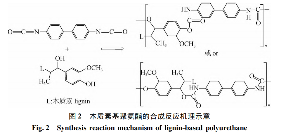 聚氨酯( PU) 胶黏剂是以多异氰酸酯和聚氨基甲酸酯为主要成分的胶黏剂的统称,是一种具有优异性能的高分子材料。根据相关报道,最早的 PU 是由 Otto Bayer 于 1937 年合成出来的[1 - 2],由异氰酸酯与亲核试剂( 如能够电离出活泼氢的羧酸类、醇类、胺类等物质) 经加成、原子重排后形成的一种嵌段共聚物。因此,PU 的分子结构中含有大量的氨酯基( —NHCOO—) 和异氰酸酯基( —NCO) ,同时可以根据分子链的柔性,将 PU 的分子链分为软段分子链与硬段分子链。其中构成软段分子链的物质主要是线性低聚物,组成硬段分子链的则是携带苯环、异氰酸酯基等刚性分子结构的小分子交联剂、扩链剂。PU 固化后具有出色的成膜性、柔韧性、耐磨性、耐溶剂侵蚀性[3 - 5]等,在胶黏剂领域[6 - 8]已经得到一定程度的应用。PU 胶黏剂具有优异的抗剪切、抗冲击性能,在木材、金属、玻璃等不同材料表面都表现出极高的黏接力,适用于各种胶接性能要求较高的应用领域。但由于合成 PU 的原料来自石油等不可再生资源,存在生产成本高、生产过程有毒、原料不可再生、产品固化后难降解等问题,导致 PU 成为一种难以持续利用的高分子材料。随着资源、环境问题的日益加剧,PU 胶黏剂的发展也开始向生物质材料方向转型。因此为了可持续的经济发展,研究者们尝试使用生物质原料作为替代品,以开发绿色环保的生物质基 PU。而木质素作为一类天然可再生的芳香族高分子化合物,具有来源丰富、可再生、价格低廉的特点,其分子结构中既含有芳香族结构又含有羟基等丰富的功能性基团,可作为多元醇与异氰酸酯反应用于 PU 的合成,同时也可以提高 PU 的力学性能和耐热性能[8 - 9]。但由于木质素大分子结构的复杂性和存在较大的空间位阻等,真正能够用于大规模生产的实例还非常少。在当今全球石化资源日益紧缺而迫切希望能以生物质资源对其有效取代的背景下,如何以木质素为原料制备聚氨酯胶黏剂是一项十分有意义的研究工作。