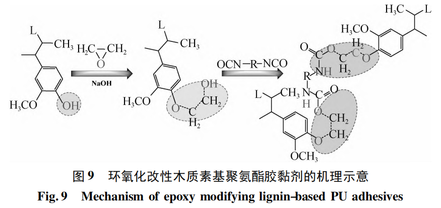 环氧化改性能够在催化剂存在的条件下将木质素的酚羟基转化生成空间位阻更小、反应活性更高的醇羟基,从而降低环氧化改性木质素的反应条件。环氧化木质素在 PU 胶黏剂的合成中既有交联作用,同时也可以作为 PU 分子中的硬段部分,提高改性 PU 胶黏剂的力学性能,但断裂伸长率容易下降,而且环氧化改性所生成的醇羟基的反应活性要弱于胺化改性时所生成的氨基的活性。