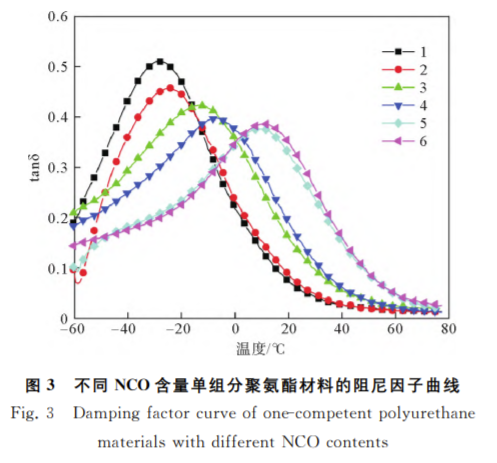 图3为不同 NCO 含量的单组分聚氨酯 材料阻尼因子的测试结果。观 察 发 现,随 着 温度 升 高,阻 尼 因 子(tanδ)先 上 升 后 下 降, 在玻璃化转变区域出现阻尼损耗峰。分析原 因,当 温 度 远 低 于 玻 璃 化 转 变 温 度(Tg)时, 材料内部自由体积小,柔顺的-C-O-C- 链段无运动空间,处于“冻结”状态,仅有键长 伸缩振动、键角的变形振动以及侧-CH3等 基团的微布朗运动,材料处于玻璃态;材料受 到交变应力作用时,应变的响应时间短,应变 可以跟得上应力的变化,材料内摩擦作用弱, 阻尼因子较小。随着温度升 高,材 料 自 由 体 积增大,-C-O-C-、-C-C-等 链 段 的 运动空间逐步释放,可通过σ 键的内旋转改 变构象,材料进入玻璃化转变区;在交变应力作用下,受体系黏度的影响应变的响应时间较长,应变滞后于应 力的变化,材料的内摩擦作用明显,阻尼因子升高。随温度继续升高,材料自由体积增大至可满足与四亚甲基、苯环、酯基、氨基甲酸酯等基团相连链节的运动,相邻键的内旋转协同作用得以实现,材料进入高弹态,体 系黏度进一步降低,在交变应力作用下应变响应的滞后效应逐步缓解,链段运动受到的内摩擦力降低,阻尼 因子tanδ 下降[17]。