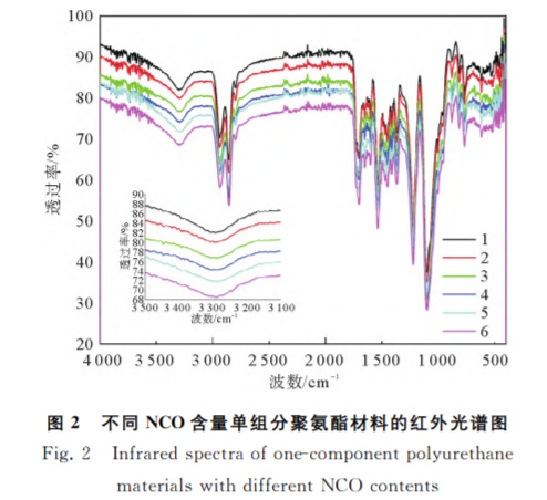 图2为不同 NCO 含量的单组分聚氨酯 材料的红外光谱测试图。分析发现,2280~ 2240cm-1范围内没有明显的 NCO 伸缩振 动吸收峰,表明-NCO 活性基团已经完全反 应。2937cm-1附近与2853cm-1附近为- CH3、-CH2-的 不 对 称 与 对 称 伸 缩 振 动 吸 收峰,1700cm-1附近为氨基甲酸酯、取代脲 基、酰胺 基 中 C=O 伸 缩 振 动 吸 收 峰,1534 cm-1附近为 C-N 的伸缩振动吸收峰,1224 cm-1附近为氨基甲酸酯-C-O-振动吸收 峰,1100cm-1附近为 C-O-C伸缩振动吸 收峰[16]。3300cm-1附近为氨基甲酸酯、取 代脲基的-NH 伸缩振动吸收峰,研究发现随着 NCO 含量的升高,该吸收峰的强度逐渐增大,这是结构中 的氨基甲酸酯、取代脲基的含量增加的结果。此外该吸收峰位置略向低频移动,是由于结构中的极性基团的 含量增加,提高了硬段结构中-NH 与 C=O 氢键化的作用。