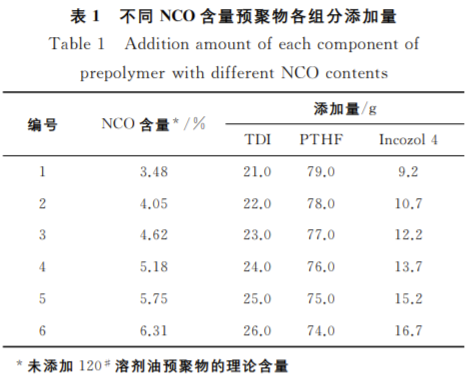 合成预聚物 将聚四氢呋喃多元醇加热至完全融化后 加入到三口烧瓶中,打 开 电 加 热 套 升 温 至 120~130 ℃;开启真空泵将烧瓶内气压降至 0.010~0.015MPa,负 压 环 境 下 脱 水1.5~ 2.0h。脱水结束后通入氮气并加入120# 溶 剂 油 (加 入 比 例 为 m 预 聚 物 ∶ m120# 溶 剂 油 = 10∶1);料温降至50~60 ℃后,将甲苯二异 氰酸 酯 加 入 烧 瓶 中,80~85 ℃ 保 温 反 应 1.5~2.0h;采 用 二 正 丁 胺 法 测 定 预 聚 物 NCO 含 量[15],达 到 理 论 值 后 即 可 充 氮 密 封 备用。合成预聚物各组分添加量列于表1。