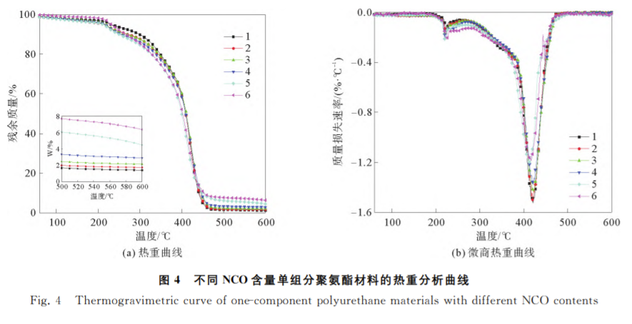 图4为不同 NCO 含量单组分聚氨酯材料的热重曲线与微商热重曲线,分析数据列于表3。观察热重曲 线图可以发现,不同 NCO 含量单组分聚氨酯材料的热重曲线趋势基本一致,但热分解速率存在一定区别。如单组分聚氨酯材料失重5%的温度(T5% )在190~230 ℃,T5% 随着 NCO 含量的增加逐渐降低;失重50% 的温度(T50% )在380~411 ℃,分解速率最大时的温度(Tp)在388~423 ℃,终止分解 温 度(Tf)在477~ 503 ℃,均随着 NCO 含量的增加先增加后降低。综合分析,材料的耐热性能随着 NCO 含量的增加而提高。