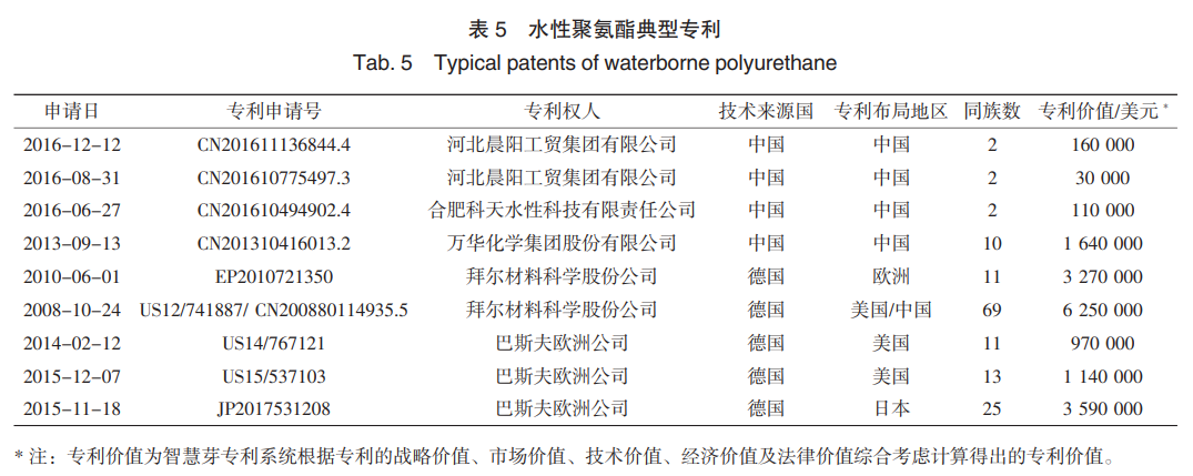表 5 中列出了水性聚氨酯领域的典型专利。
