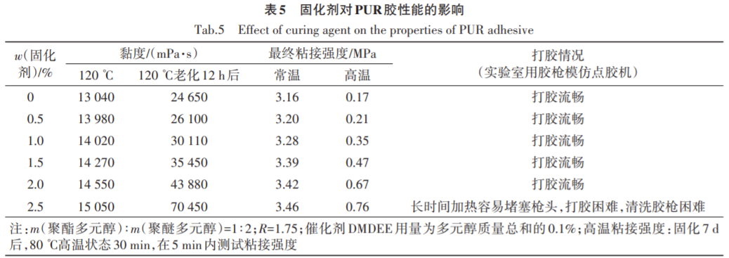 由表5可知:随着固化剂的加入,PUR胶的常温 最终粘接强度、高温粘接强度得到提高,特别是高 温粘接强度增加比较明显。在本体系中,所选用的 固化剂为四官能度,其活性相对较高,并且发现固 化剂添加越多其黏度略有增加,特别是其黏度稳定 性明显增加。固化剂的加入,虽然加快胶体固化的 速度,但并不是添加量越多越好。实际操作应用过 程中,反复加热会使得产品黏度增加过快,易出现 过快的结皮现象,同样会造成打胶设备堵塞,增加 打胶难度,快速固化也增加设备的清洗成本。综合 实际应用及性能考虑,固化剂添加量为多元醇质量 分数的0.5%~2.0%较为合适。