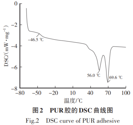 由图 2 可知:样品的玻璃化转变温度(Tg )为 −46.5 ℃,软化点(Tm)为 56.0 和 69.6 ℃,其中两个软 化点表明由两种不同的聚酯多元醇的混合反应而 成聚氨酯预聚体。合适的玻璃化转变温度和软化 点温度,使得该聚氨酯热熔胶具备了合适的表干时 间及后固化速度,同时具备良好的耐高低温性能。