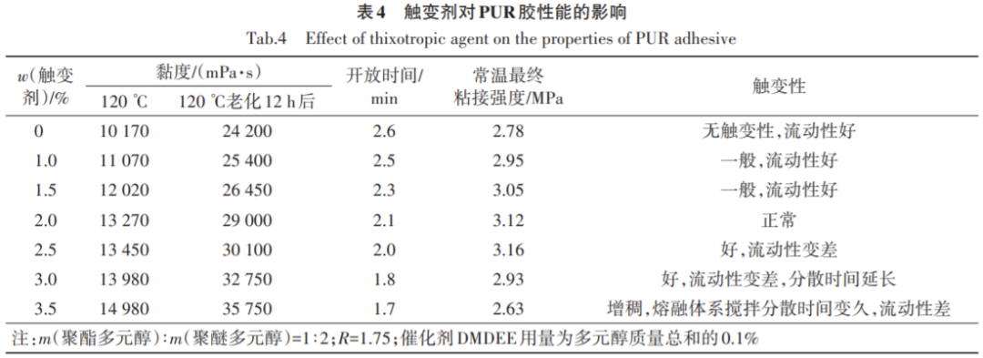 由表 4 可知:随着触变剂的加入,PUR 胶的黏度、稳定性黏度增加,开放时间有所缩短。但不是 添加的越多越好,最终粘接强度出现了先增加后减 少的趋势。触变剂添加过多时,与聚氨酯热熔胶体 系的相容性变差,体系各组分间相互作用变弱,内 聚力变差,导致剪切强度下降。另外,触变剂用量 过多会使聚氨酯热熔胶流动性变差许多,不利于润 湿粘接基材,也会导致粘接效果变差[16] 。综合成本 及性能考虑,触变剂添加量为多元醇质量分数的 1.0%~2.5%较为合适。