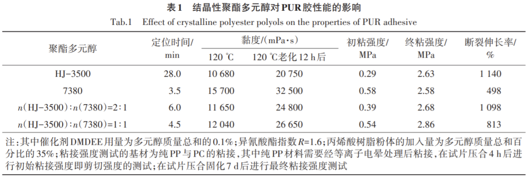 本研究结合以往经验,先固定m(聚酯多元醇)∶ m(聚醚多元醇)=3∶7比例时,摸索不同结晶性能及 比例的聚酯多元醇对聚氨酯热熔胶性能的影响,其 中选用相对分子量相同的两种结晶性聚酯进行试 验,其结果如表1所示。