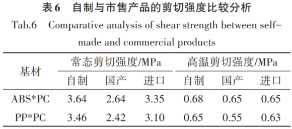 选用自主研发的产品与目前车灯厂家在用的 市售产品(国产、进口)进行比较,从常态剪切强度、 高温剪切强度两个方面进行粘接性能对比测试,结 果如表6所示。