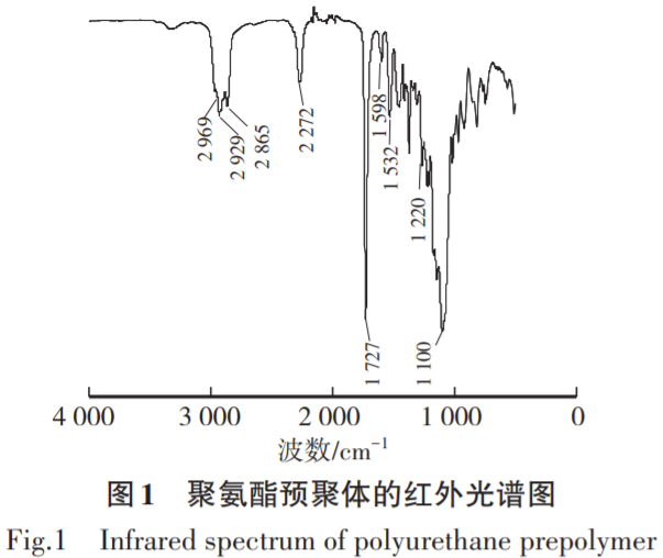 由图 1 可知 :2 969~2 865 cm-1 处 为 —CH2— 和 CH3—的吸收峰,2 272 cm-1 处有吸收峰,属于 —N=C=O 基团的特征吸收峰,1 727 cm-1处为羰 基—C=O 的伸缩振动特征峰,1 598 cm-1 附近为含 苯环骨架结构的伸缩振动特征峰,1 532 cm-1处为 —NH—变形振动吸收峰,1 220和 1 100 cm-1 处为醚 基团—C—O—C—的伸缩振动吸收峰。通过红外表征可以确定,合成产物为异氰酸酯封端的聚氨酯预聚体。