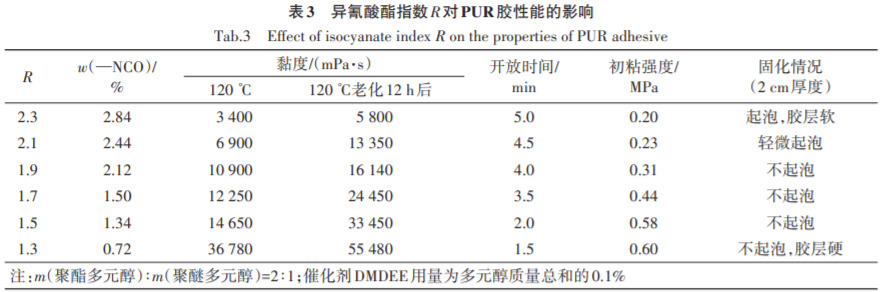 异氰酸酯指数 R 即 n(—NCO)∶n(—OH)的比 值。异氰酸酯指数 R 对 PUR 胶性能的影响如表 3 所示。