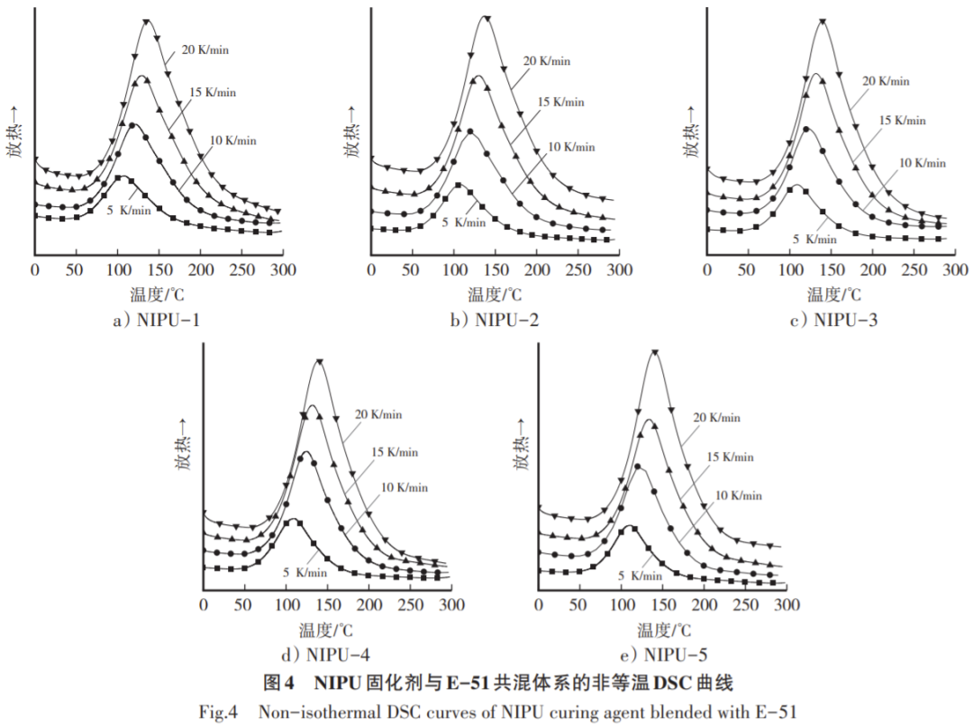 采用DSC详细考察了系列NIPU固化剂与E-51 的混合固化反应,不同升温速率下的 DSC 曲线如 图4所示。由图4可知:NIPU固化剂与E-51混合固 化反应过程伴随着放热现象,并且每一条热流曲线 均只有一个放热峰。相同的升温速率下,系列NIPU固化剂与 E-51 共混后的 DSC 曲线变化趋势基本 相同,特征温度均随着升温速率的变化而发生改变。