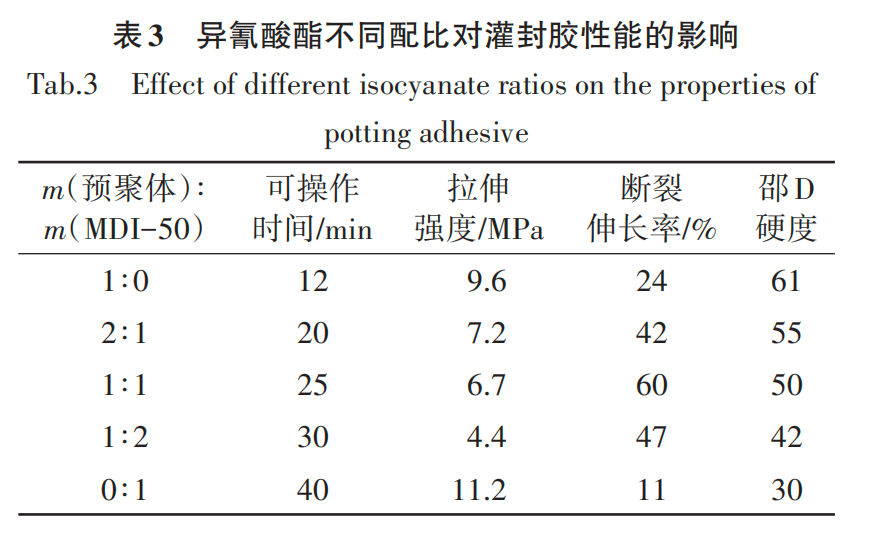 目前市场上主要采用低黏度的导热灌封胶进行填充传热,广泛使用的灌封胶有环氧树脂、有机硅和聚氨酯三类。环氧树脂类灌封胶具有耐高温、附着力好、优异的电气绝缘能力等优点,但是存在伸长率低、受冷热冲击易开裂、耐湿热性能差等缺元器件的密封。有机硅灌封胶具有耐候性好、工作温度宽泛、不开裂、具有优异的防水性能和抗震能力,但存在附着力差、强度低、抗撕裂性能差等缺点,受挤压后不易保持电池固定,造成电池包故障。聚氨酯灌封胶具有软硬度可调节、模量可调节、强度适中、高弹性、高抗冲击性、高耐磨性和优异的耐低温性能等特点,结合电池包模组设计,聚氨酯灌封胶可以更好地匹配电芯的粘接固定及导热,在新能源车领域得到广泛应用[3-5] 。双组分聚氨酯灌封胶主要由多元醇、异氰酸酯、导热填料、阻燃剂、消泡剂和催化剂等组分组成,早前的研究及报道主要是针对电力、照明等领域的灌封,针对动力电池的聚氨酯灌封胶研究较少[6-8] 。