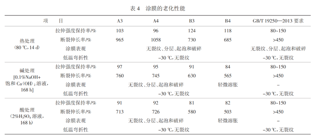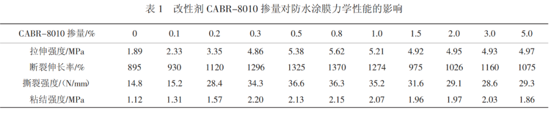 称取适量单组分湿固化聚氨酯防水涂料,用刮板均匀涂刷在涂好脱模剂的模具上,分 2~3 次涂完,制备成厚 1.5 mm的涂膜,放置在温度(23±2)℃、相对湿度(50±10)%的标准试验条件下养护 7 d,按照 GB/T 19250—2013《聚氨酯防水涂料》和 GB 55030—2022《建筑与市政工程防水通用规范》测试相关性能。