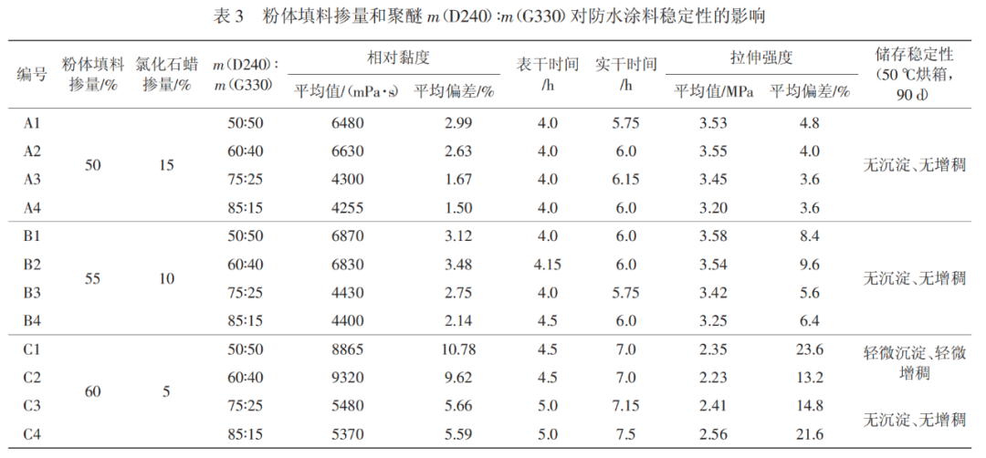 聚醚多元醇(D240、G330),佳化化学(滨州)有限公司;甲苯二异氰酸酯(TDI-80),巴斯夫(中国)有限公司;改性剂CABR-8010,自制;催化剂(WS2),广州优润合成材料有限公司;催化剂 DMDEE,亨斯迈;52# 氯化石蜡,广西中南油化工股份有限公司;硫酸钡,粒径 1.6 μm,青岛天象精细化工有限公司;重质碳酸钙,1200 目,市售;分散剂(F108),杭州临安涂料助剂化工有限公司;150# 溶剂油,江苏华伦化工有限公司。以上原料均为工业级。MZ-2000B 型拉力试验机;DHG-9420B 型电热鼓风干燥箱;SPX-350-C 恒温恒湿养护箱。
