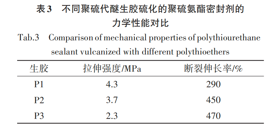 试验选用了 3种不同的聚硫代醚生胶,P1分子量为2 396,多分散系数为2.51,生胶黏度为17 Pa·s;P2 分子量为 3 749,多分散系数为 2.64,生胶黏度为23 Pa·s;P3 分子量为 5 210,多分散系数为 2.87,生胶黏度为48 Pa·s。三者的官能度一致,根据其分子量的不同,计算得到生胶与硫化剂的适用配比。使用的硫化剂为HMDI,催化剂为1-甲基咪唑。3种密封剂材料硫化后测试其力学性能,结果如表3所示。