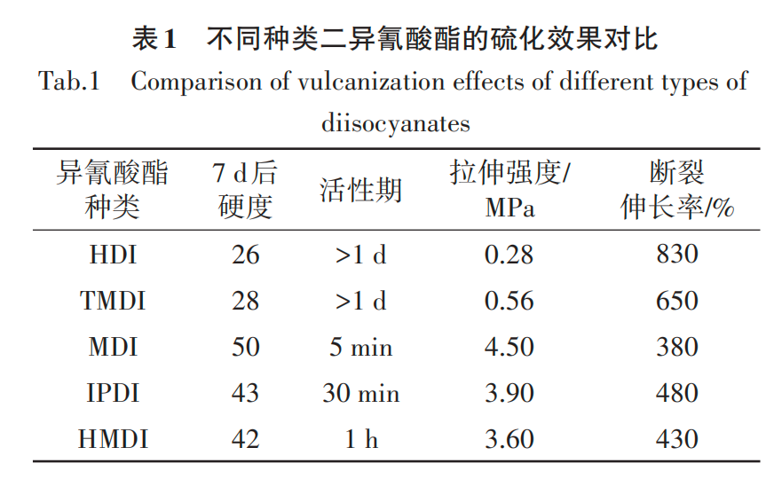 本文对比不同种类二异氰酸酯的硫化效果,选用的异氰酸酯有 HDI、TMDI、MDI、IPDI 和 HMDI。试验中各自的添加配比通过聚硫代醚基膏的相对分子量和官能度可以计算得到,统一选择聚硫代醚基膏1%的1-甲基咪唑作为催化剂。通过试验对比其硫化反应的活性和效果,结果如表1所示。